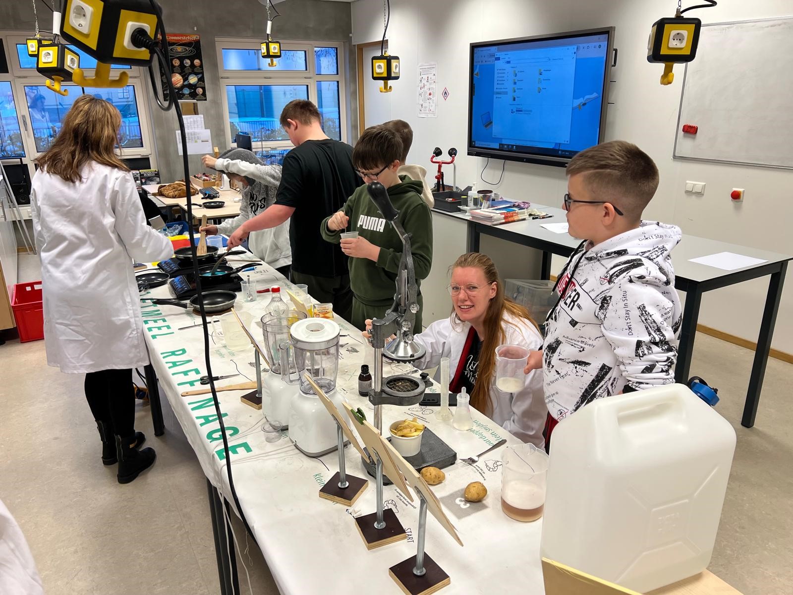 We hebben ter voorbereiding al zetmeel gemaakt van aardappelen. Door ze fijn te malen in een blender worden de cellen opengebroken en komt het zetmeel vrij. Dit wordt vervolgens gescheiden door een proces van wassen, roeren en bezinken.